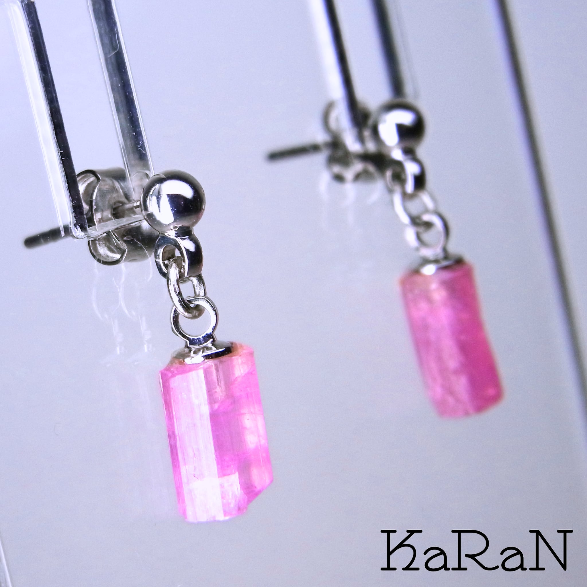 ピンクのしっかりと結晶の形をしたトルマリンを使ったピアスです。